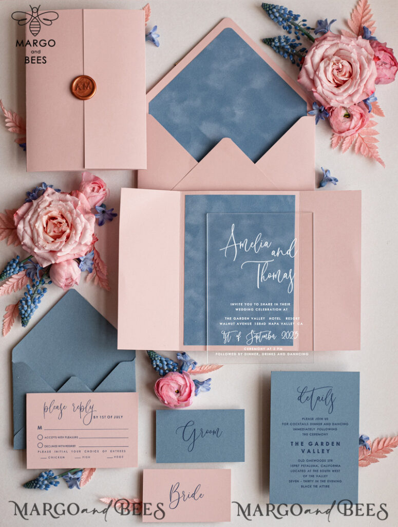 Bespoke Acrylic blush pink wedding invitation, Glamour Velvet dasty blue Wedding Invitations Golden Shine Plexi Wedding Invitation Suite Luxury Wedding Cards wax seal Copper