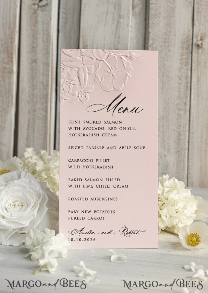 Make a lasting impression on your guests with our Elegant Wedding Menu Cards With Floral Leaf Motif. These beautifully crafted menu cards will not only guide your guests through the culinary delights of your wedding reception but will also serve as a stunning keepsake for years to come. Add a touch of elegance to your special day with our Embossed Blush Pink Wedding Menu cards.