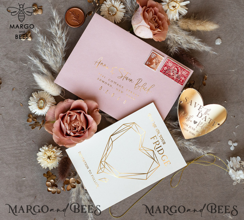 Personalised Gold Acrylic Heart Save the Date Magnet and Card, blush Pink Wedding Save The Dates Plexi Magnets, Wedding Boho Save The Date Cards